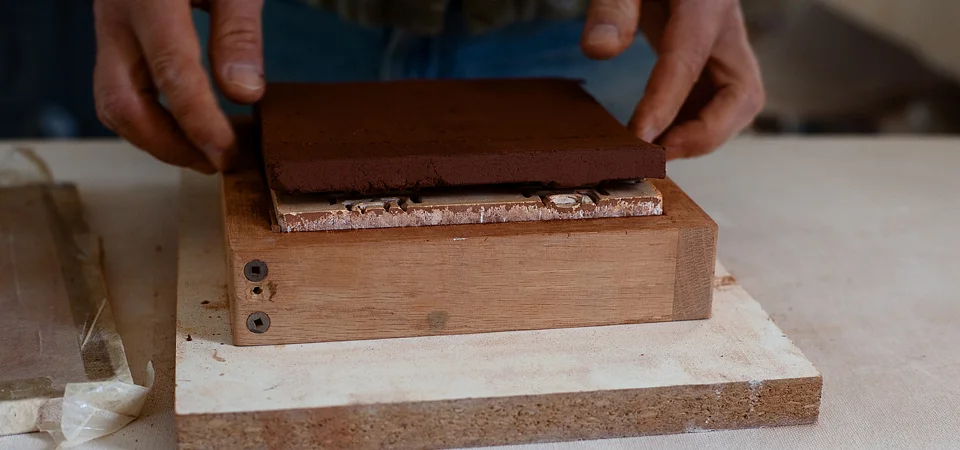 After compaction, the tile is popped out of the press and carefully peeled from the plaster floor.