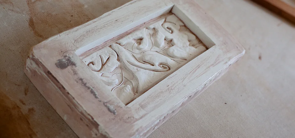 Plaster molds are required for the high relief tile and are made from an original hand carved tile. Custom designs may be requested, requiring a new plaster mold. Custom molds take an additional two-three weeks to make and dry properly before use.